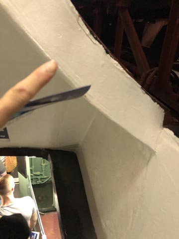 艦橋の丸窓。当時は防弾ガラスがなかったのか、戦闘時には防弾板で護るらしい。スリットの狭い視野じゃよく見えないだろうに。