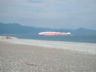 油抜き取り作業の真っ最中。それが終わると、解体・撤去作業が始まる。来年の夏には完全になくなってしまう。はず。フィンスタビライザーがヒレのように見え、打ち上げられた魚みたい。